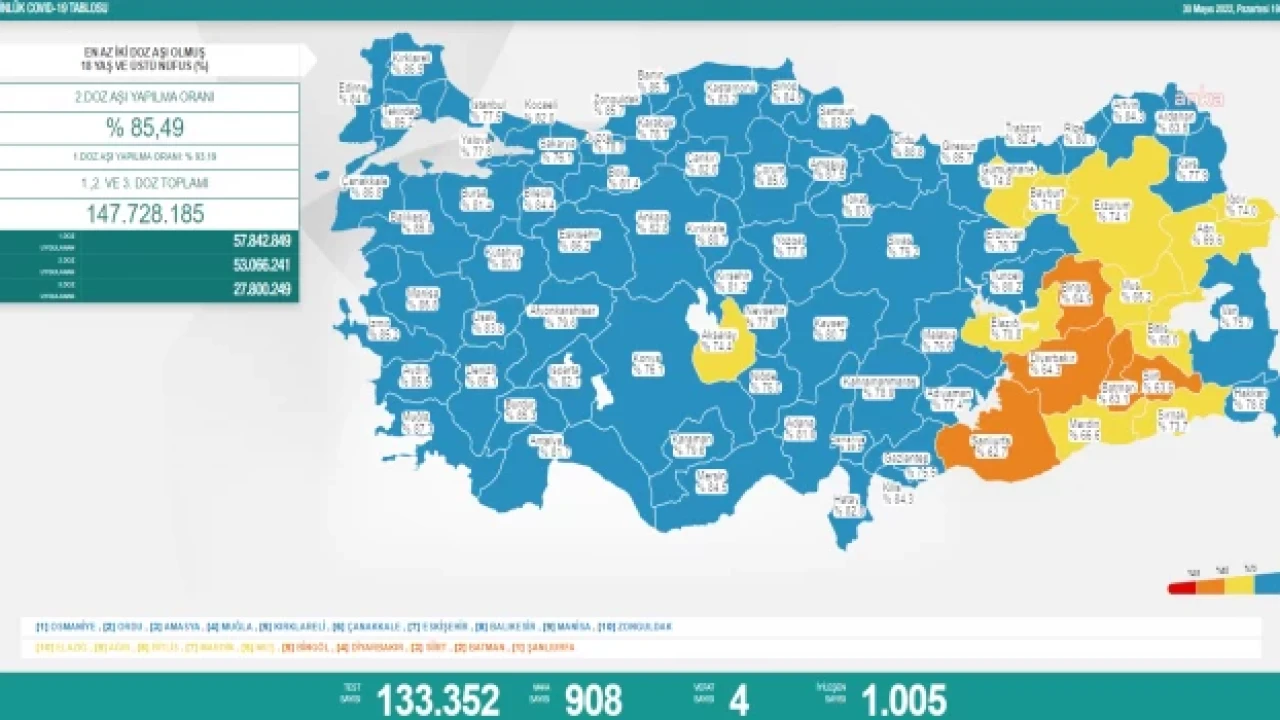 Sağlık Bakanlığı’nın 30 Mayıs’a ilişkin koronavirüs verilerine göre; son 24 saat içerisinde yapılan 133 bin 352 testten 908’i pozitif çıktı. Virüs nedeniyle 4 kişi daha hayatını kaybetti. İyileşen hasta sayısı 1005 olarak açıklandı.