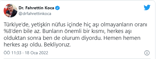 Koca Twitter hesabından yaptığı paylaşımda, “Türkiye’de, yetişkin nüfus içinde hiç aşı olmayanların oranı yüzde 8’den bile az. Bunların önemli bir kısmı, herkes aşı olduktan sonra ben de olurum diyordu. Hemen hemen herkes aşı oldu. Bekliyoruz” ifadelerini kullandı.