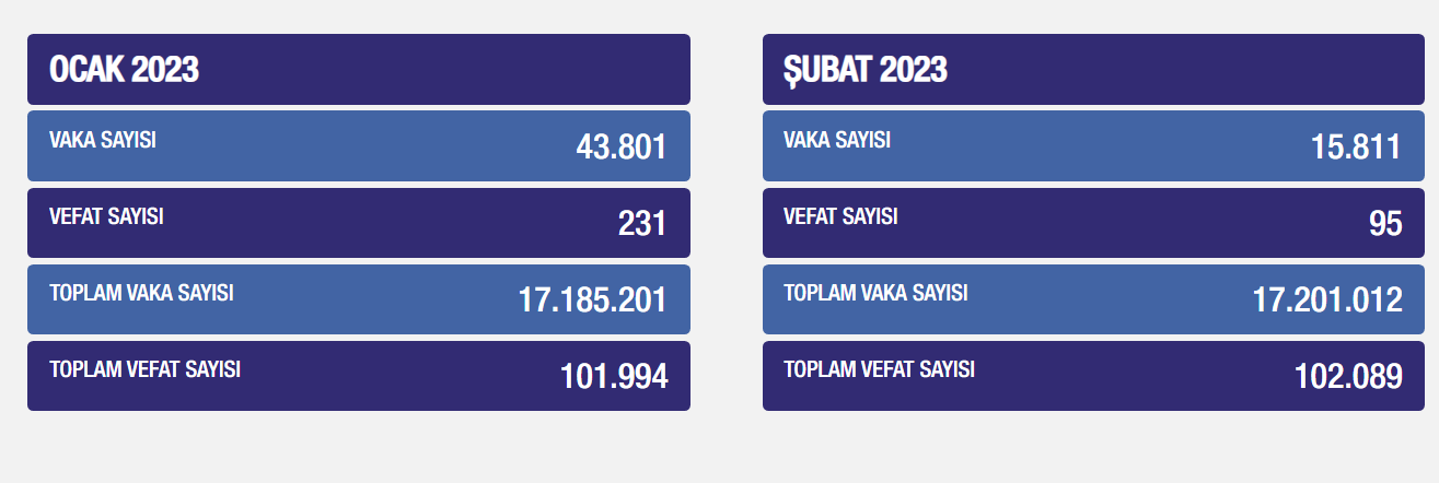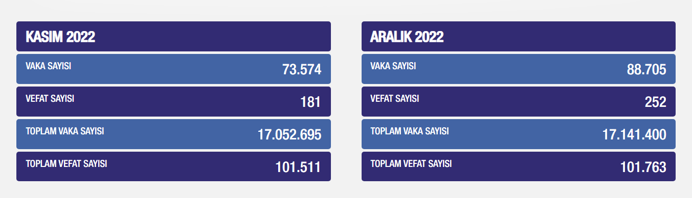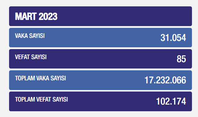 Tabloda iyileşen sayısı olmadığı için aktif vaka sayısı belirsiz. Bakanlık verilerine göre, kasımın son 3 gününde 10 bin civarında yeni vaka geldiği görüldü. 2022 Kasım ayı toplam 73 bin 574 vaka ve 181 ölüm ile kapandı. Aralık 2022’de 88 bin 705 vaka ve 252 ölüm, Ocak 2023’te 43 bin 801 vaka 231 ölüm, şubatta 15 bin 811 vaka ve 95 ölüm, martta ise 31 bin 54 vaka ve 85 ölüm gerçekleşti. Böylece mart sonu itibarıyla toplam vaka sayısı 17 milyon 232 bin 66 olurken, toplam vefat sayısı da 102 bin 174’e ulaştı.