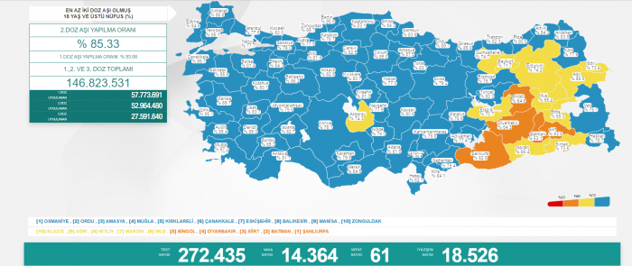 Sağlık Bakanlığı'nın sitesinden alınan verilere göre 28 Mart 2022 tarihinde 272.435 koronavirüs testi yapılırken 14.364 koronavirüs pozitif vakası ile karşılaşıldı. 61 kişi hayatını kaybetti. İyileşen sayısı ise 28 Mart 2022 tarihinde 18.526 oldu.