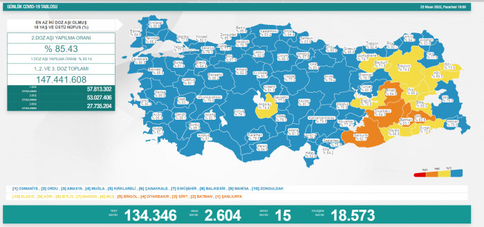 Sağlık Bakanlığı, 'Günlük Covid- 19 Tablosu' verilerini açıkladı. Son 24 saatte yapılan 134 bin 346 testte 2 bin 604 vaka tespit edildi. 15 kişi hayatını kaybederken, 18 bin 573 kişinin de tedavisi ve karantinası sona erdi.
