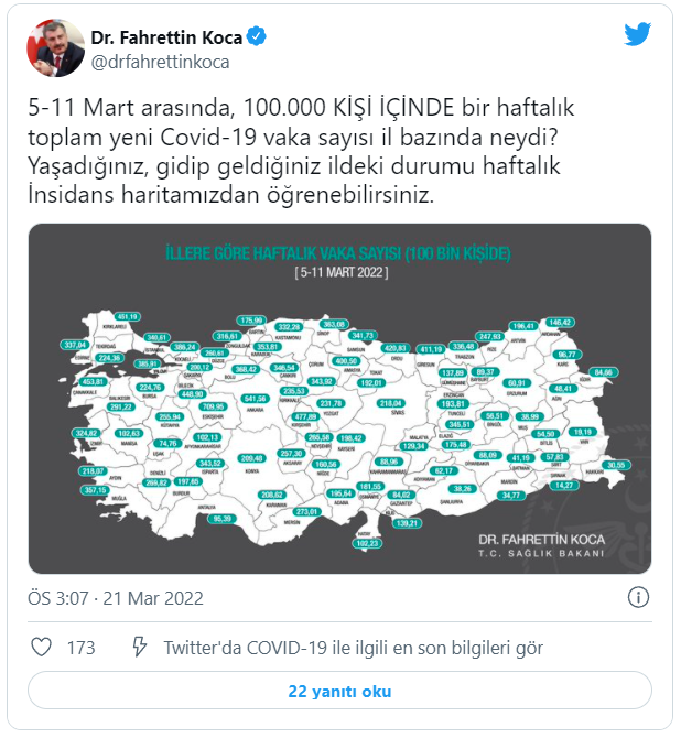 Sağlık Bakanı Koca, illere göre haftalık COVID-19 vaka sayısı haritasını paylaştı.