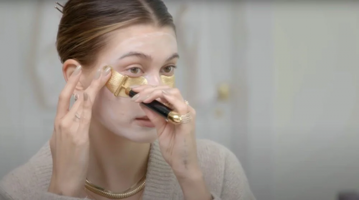 Yüz yogası genelde yüz hareketleri ve eller ile yapılıyor ama destekleyici bazı ürünleri kullanarak daha etkili bir masaj sağlayabilirsiniz. Model Kaia Gerber, gua sha taşını yüzünde harekete ettirerek cilt kaslarını hareket ettiriyor.