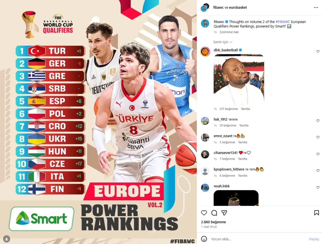 FIBA'nın ABD merkezli sosyal medya platformu Instagram hesabından paylaşımında Türkiye, Katar'da düzenlenecek 2027 FIBA Dünya Kupası'na katılma yolunda Avrupa Elemeleri'nde mücadele eden ülkeler arasındaki güç sıralamasında ilk sırada yer aldı.