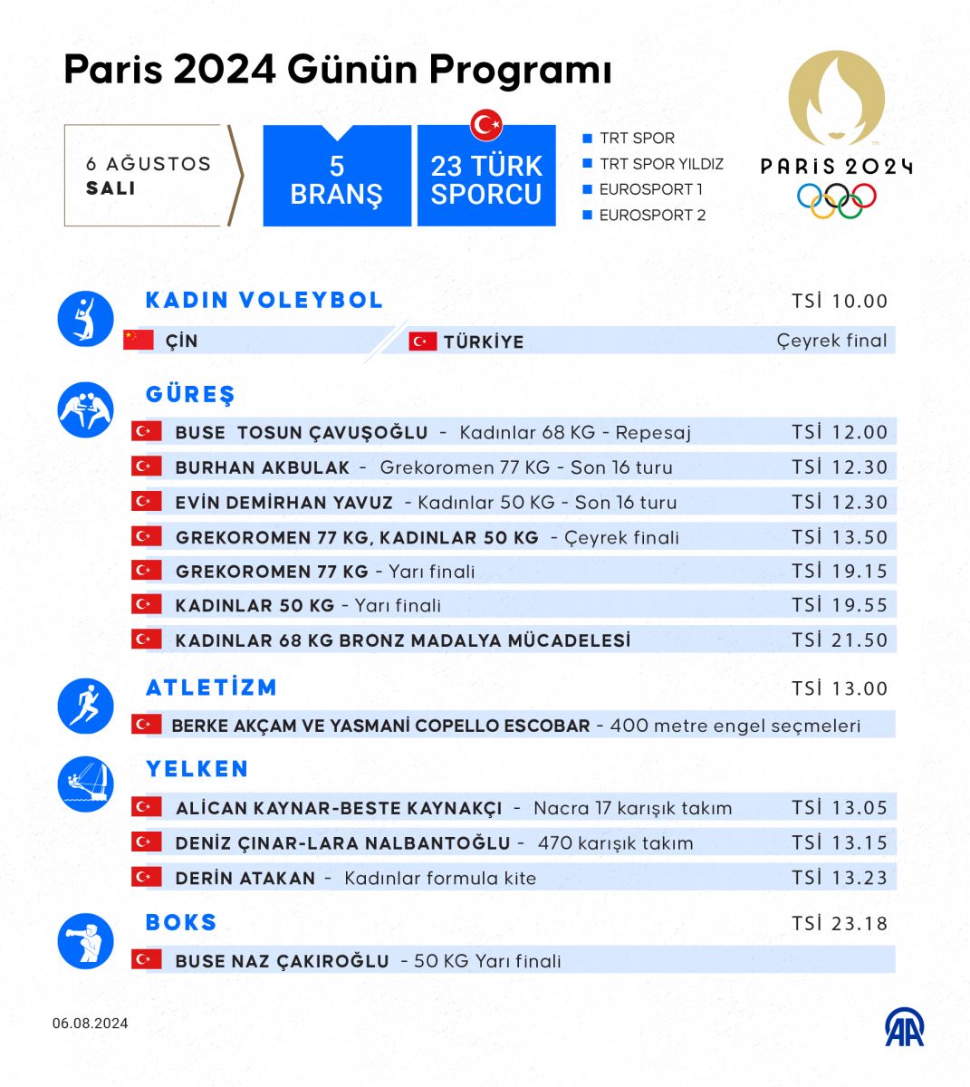 Türkiye’den farklı branşlarda mücadele etmek üzere Paris Olimpiyat Oyunları’na katılan sporcular için 6 Ağustos olimpiyat programı da belli oldu.