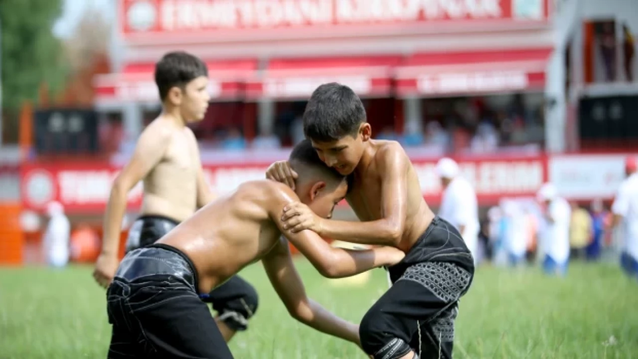 Tarihi Sarayiçi Er Meydanı'nda kule hakemlerinin çağrısıyla sahaya gelen minik-1 boy pehlivanları, rakipleriyle kol bağlamaları sonrası peşreve çıktı.