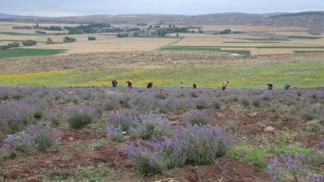 Çamlıbel beldesinde atıl durumda bulunan ve Valilik tarafından bir üreticiye tahsis edilen araziye dikilen 1 milyon 320 bin lavanta fidesinin hasadına başlandı.
