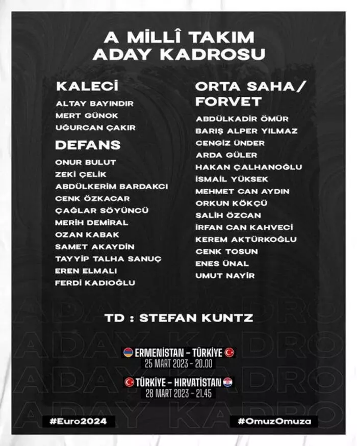 A Milli Futbol Takımı'nın, 2024 Avrupa Şampiyonası Elemeleri’nde Ermenistan ve Hırvatistan’la oynayacağı karşılaşmaların aday kadrosu açıklandı.