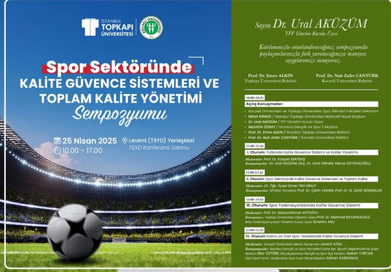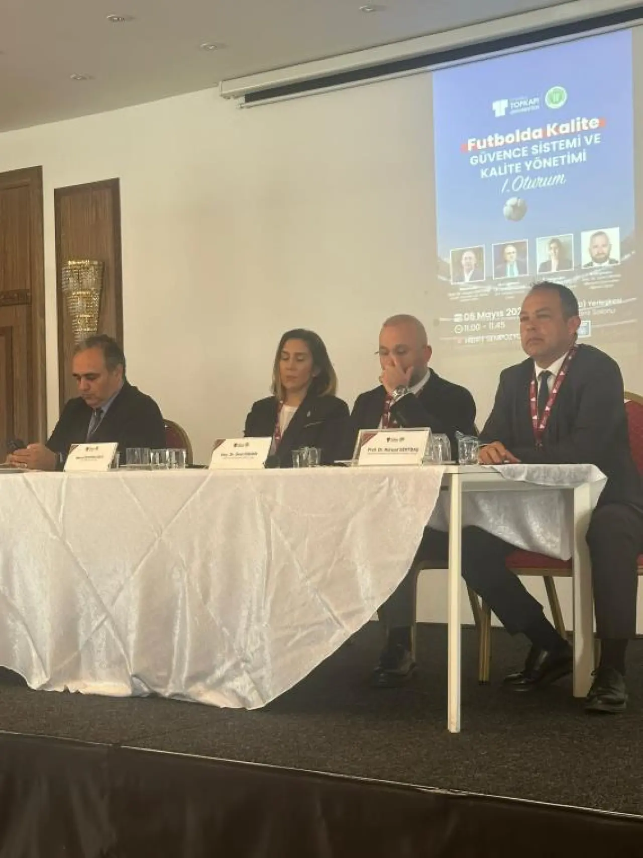 Türkiye Futbol Federasyonu Amatör Futbol, Kadın Futbolu ve Engelli Futbolundan Sorumlu Yönetim Kurulu Üyesi Ural Aküzüm, Topkapı Üniversitesi ve Kocaeli Üniversitesi tarafından TSYD Konferans Salonu'nda gerçekleştirilen "Futbolda Kalite - Güvence Sistemi ve Kalite Yönetimi" konulu sempozyumda konuştu.