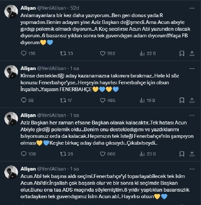Fenerbahçe'nin bulunduğu durumda ihtiyacı olan tek başkanın Acun Ilıcalı olduğunu belirten Alişan, "Acun Abi tek başına aldı seçimi.Fenerbahçe’yi toparlayabilecek tek isim Acun Abi’dir.İnşallah çok başarılı olur ve bir sonra ki seçimde Başkan olur.Bunu ona taa ADS maçında söylemiştim.6 yıldır yaptıkları basarısızlık ortadayken tek guvendıgımız isim Acun abi..Hayırlısı olsun" şeklinde paylaşım yaptı. Ancak bir çok takipçisi ve sosyal medya kullanıcısı Alişan'a tepki gösterdi. Kısa sürede sosyal medyada Alişan'ın paylaşımları TT oldu.
