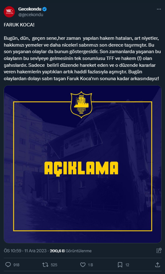 Ankaragücü taraftar grubu Gecekondu X hesabından paylaşım yaparak Faruk Koca'ya desteklerini iletti.