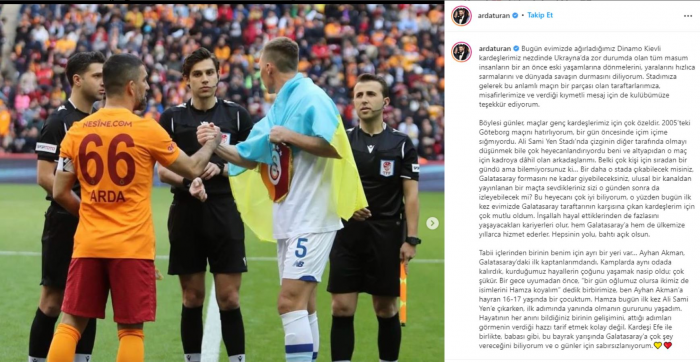 "Evimizde ağırladığımız Dinamo Kievli kardeşlerimiz nezdinde Ukrayna'da zor durumda olan tüm masum insanların bir an önce eski yaşamlarına dönmelerini, yaralarını hızlıca sarmalarını ve dünyada savaşın durmasını diliyorum. Stadımıza gelerek bu anlamlı maçın bir parçası olan taraftarlarımıza, misafirlerimize ve verdiği kıymetli mesaj için de kulübümüze teşekkür ediyorum.