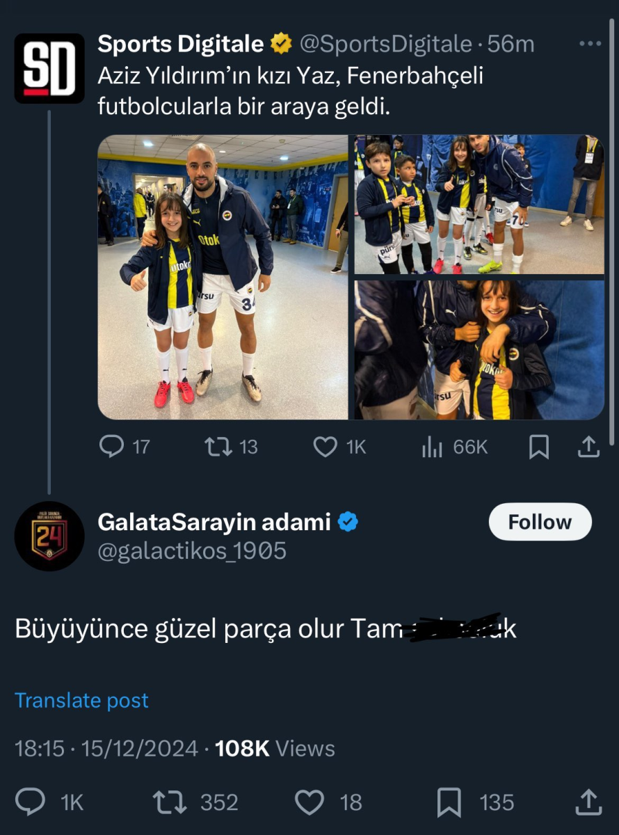 Fenerbahçe'nin eski başkanı Aziz Yıldırım'ın kızı Yaz Yıldırım'a yönelik sosyal medyada yapılan paylaşıma tepki yağdı.