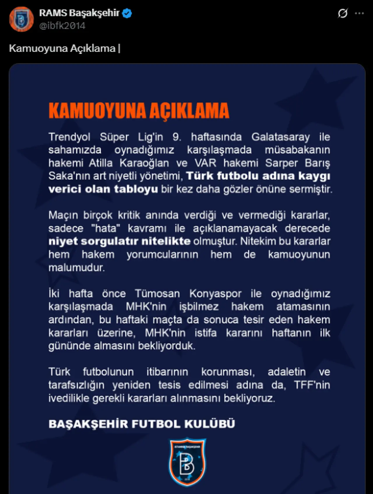 “Süper Lig'in 9’uncu haftasında Galatasaray ile sahamızda oynadığımız karşılaşmada müsabakanın hakemi Atilla Karaoğlan ve VAR hakemi Sarper Barış Saka'nın art niyetli yönetimi, Türk futbolu adına kaygı verici olan tabloyu bir kez daha gözler önüne sermiştir.