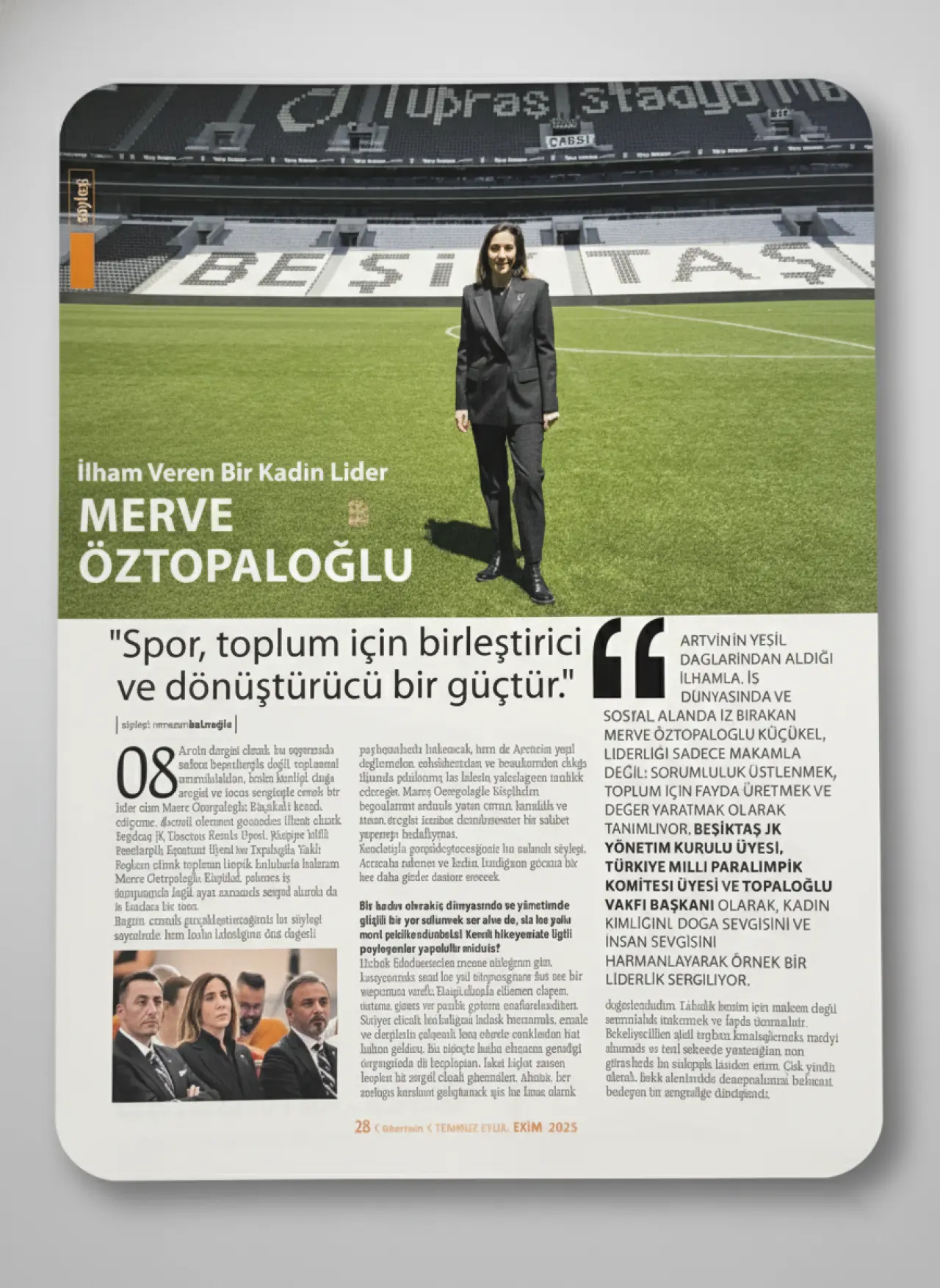 Beşiktaş JK Yönetim Kurulu Üyesi, Türkiye Milli Paralimpik Komitesi Üyesi ve Topaloğlu Vakfı Başkanı Merve Öztopaloğlu, bir dergiye verdiği röportajda; spordan kadın güçlenmesine, sosyal sorumluluktan doğa korumaya uzanan çok yönlü liderlik anlayışını anlattı.