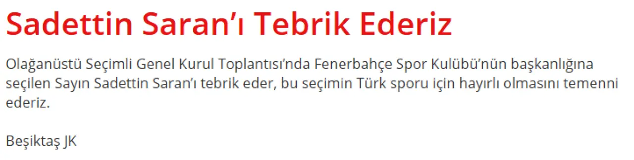 Siyah-beyazlı kulüpten yapılan açıklamada, "Olağanüstü seçimli genel kurul toplantısında Fenerbahçe Spor Kulübünün başkanlığına seçilen Sayın Sadettin Saran'ı tebrik eder, bu seçimin Türk sporu için hayırlı olmasını temenni ederiz" ifadelerine yer verildi.