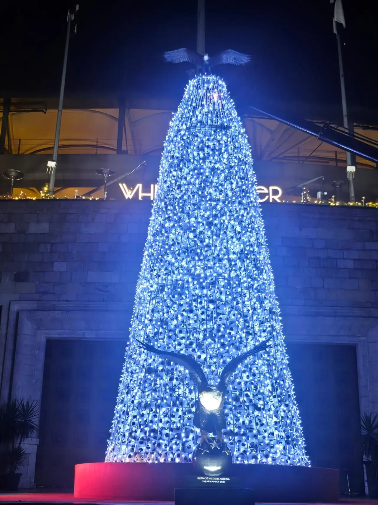 Açıklamaya göre, 2000 adet siyah-beyaz topla oluşturulan yılbaşı ağacı, Beşiktaş’ın simgesi olan kartalın kanatlarıyla taçlandırıldı. Bu tasarımın, iyiliğin yükselebileceği güçlü bir sembol olarak kurgulandığı ifade edildi.