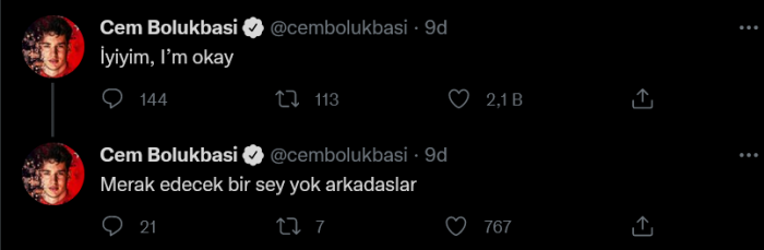 Cem Bölükbaşı, Twitter hesabından açıklama yaparak durumunun iyi olduğunu açıkladı. Bölükbaşı'nın paylaşımı şöyle: