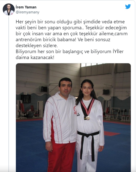 İrem Yaman, sosyal medya hesabından yaptığı paylaşımda, "Her şeyin bir sonu olduğu gibi şimdi de veda etme vakti beni ben yapan sporuma." ifadesini kullandı.