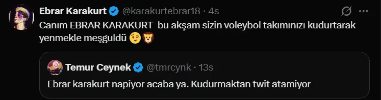 “Canım EBRAR KARAKURT bu akşam sizin voleybol takımınızı kudurtarak yenmekle meşguldü.”