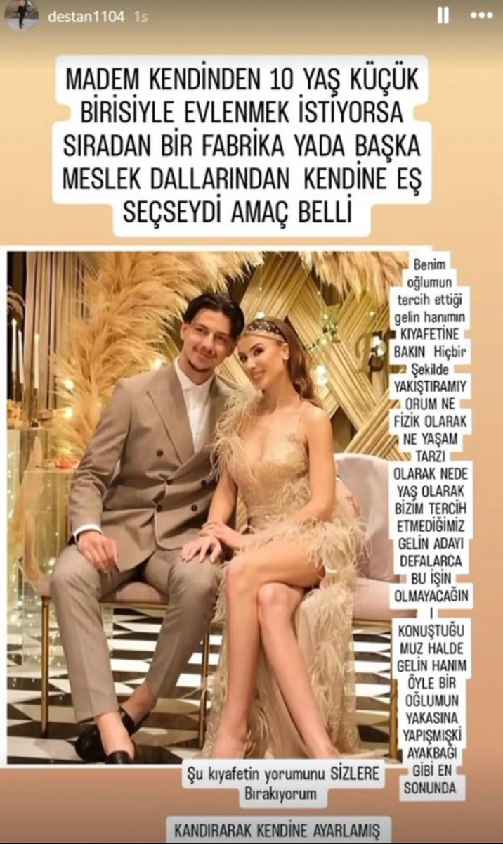 "Oğlumun tercih ettiği gelin hanımın kıyafetine bakın. Hiçbir şekilde yakıştıramıyorum. Ne fizik olarak, ne yaşam tarzı olarak, ne de yaş olarak. Bizim tercih etmediğimiz gelin adayı. Defalarca bu işin olmayacağını konuştuğumuz halde gelin hanım oğlumun yakasına yapışmış. Biz anne baba olarak nişanda bulunmadık. Kız her şeyi kendi planlamış. Acelesi var. Sonra elinden kaçar. Madem kendinden 10 yaş küçük birisiyle evlenmek istiyorsa sıradan bir fabrika ya da başka meslek dallarından kendine eş seçseydi. Amaç belli."