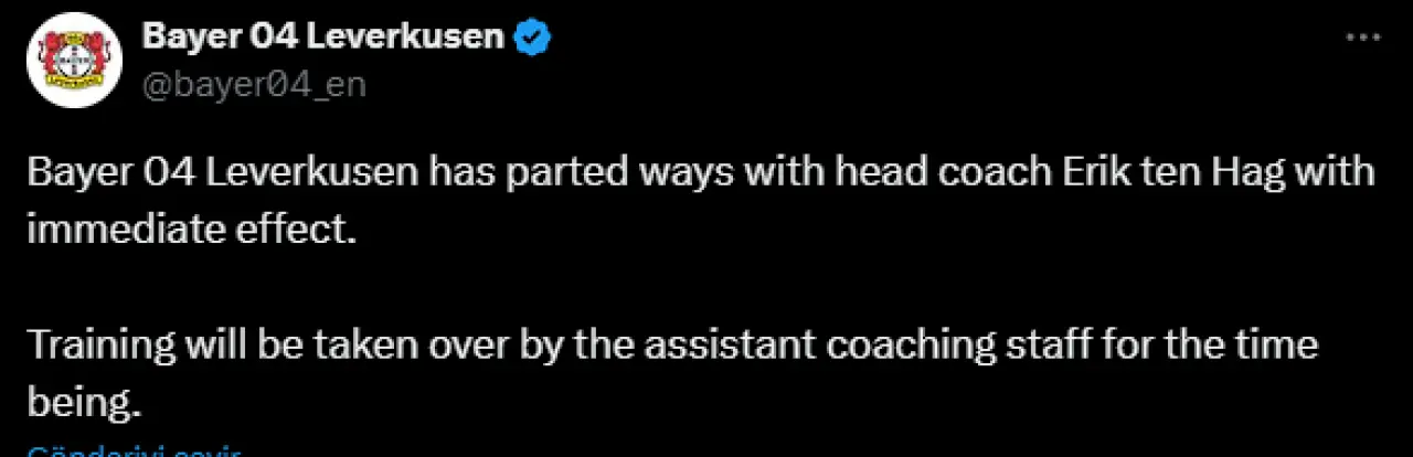 Almanya 1. Futbol Ligi (Bundesliga) takımlarından Bayer Leverkusen, sezon başında göreve getirilen Erik Ten Hag ile yolların ayrıldığını duyurdu.