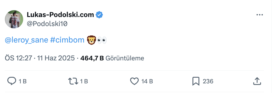 Alman yıldız, sosyal medya hesabından Leroy Sane için paylaşımda bulundu. Paylaşımında Leroy Sane'yi etiketleyen Podolski, bu paylaşımına aslan emojisi ekledi ve "Cimbom" yazdı.