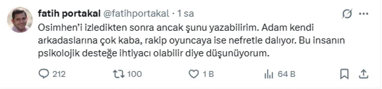 Gazeteci Fatih Portakal, sosyal medya hesabından yaptığı paylaşımda Osimhen’in davranışlarını eleştirdi: