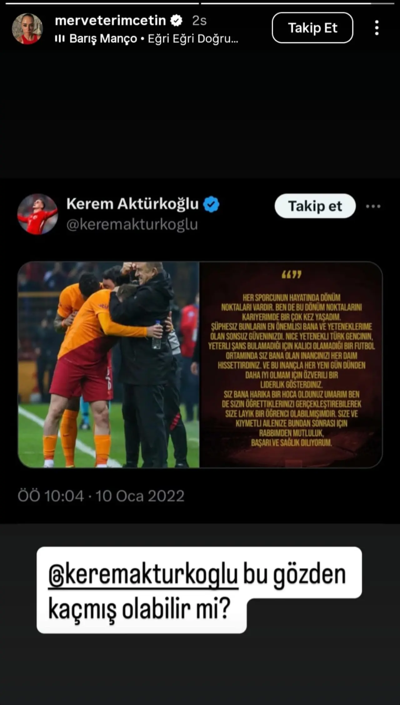 Fatih Terim’in kızı Merve Terim Çetin, Instagram hesabında Aktürkoğlu’nun 10 Ocak 2022’de babası için yaptığı veda paylaşımını paylaşarak, paylaşımına “@keremakturkoglu bu gözden kaçmış olabilir mi?” notunu ekledi. Bu hamle, futbol kamuoyunda büyük yankı uyandırdı.