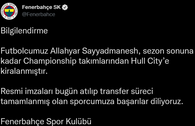 Fenerbahçe, Twitter hesabından hücum oyuncusu Allahyar Sayyadmanesh'in Acun Ilıcalı'nın satın aldığı Hull City'e kiralandığını açıkladı. Resmi imzalarından atıldığını belirten açıklama şöyle: