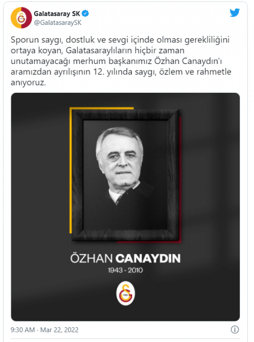 Sarı-kırmızılı kulübün sosyal medya hesabından yayımlanan mesajda, "Sporun saygı, dostluk ve sevgi içinde olması gerekliliğini ortaya koyan, Galatasaraylıların hiçbir zaman unutamayacağı merhum başkanımız Özhan Canaydın'ı aramızdan ayrılışının 12. yılında saygı, özlem ve rahmetle anıyoruz." denildi.