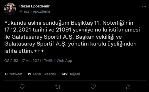 Galatasaray Spor Kulübü Derneği Başkan Yardımcısı ve Galatasaray Sportif A.Ş. Başkan Vekili Sayın Av. Dr. Rezan Epözdemir 15 Aralık 2021 tarihinde ve Galatasaray Spor Kulübü Derneği Genel Sekreteri Sayın Köksal Ünlü 16 Aralık 2021 tarihinde bu görevlerinden ve tüm yönetim kurulu üyeliklerinden istifa ettiklerini beyan etmiş ve tarafımıza bildirmişlerdir.