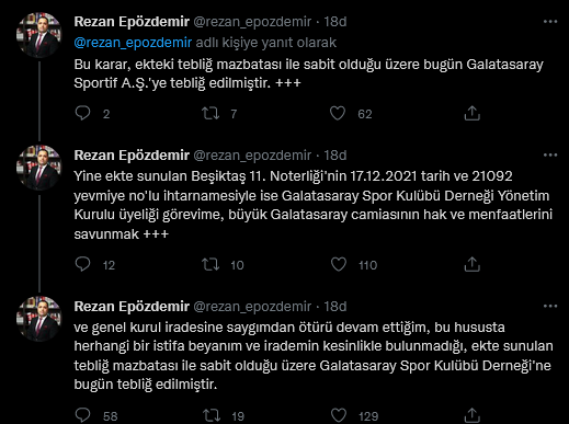 Epözdemir, yaptığı paylaşımda ihtarname, istifaname gibi belgeler paylaşırken “Galatasaray Spor Kulübü Derneği’nin biraz önce 21:01 tarihinde yapmış olduğu duyuru ve varsa dayanağı olan yönetim kurulu kararı açıkça hukuka aykırıdır” dedi.