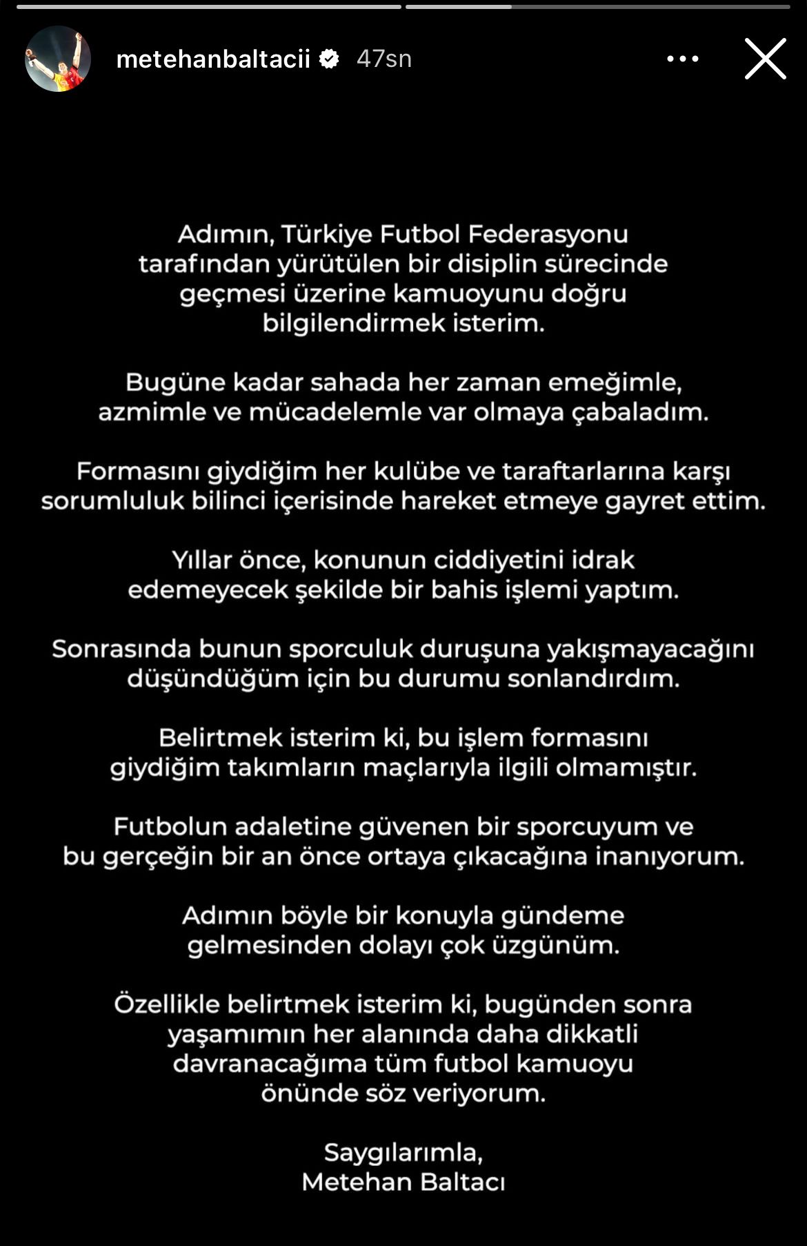Belirtmek isterim ki, bu işlem formasını giydiğim takımların maçlarıyla ilgili olmamıştır. Futbolun adaletine güvenen bir sporcuyum ve bu gerçeğin bir an önce ortaya çıkacağına inanıyorum.