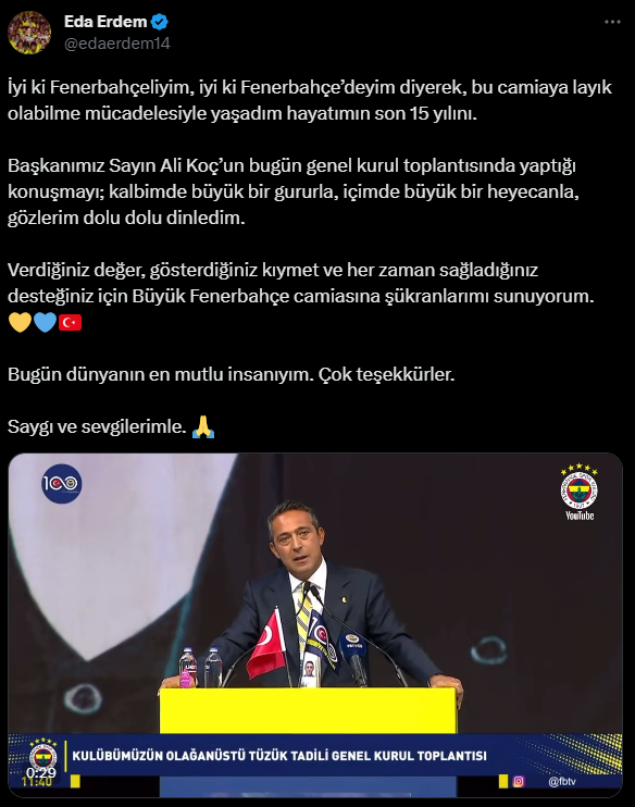 Fenerbahçe Kulübü Başkanı Ali Koç'un kendisiyle ilgili açıklamalarını gözleri dolu şekilde dinlediğini ifade eden Erdem, "İyi ki Fenerbahçeliyim, iyi ki Fenerbahçe'deyim diyerek, bu camiaya layık olabilme mücadelesiyle yaşadım hayatımın son 15 yılını. Başkanımız Sayın Ali Koç'un bugün genel kurul toplantısında yaptığı konuşmayı; kalbimde büyük bir gururla, içimde büyük bir heyecanla, gözlerim dolu dolu dinledim." dedi.
