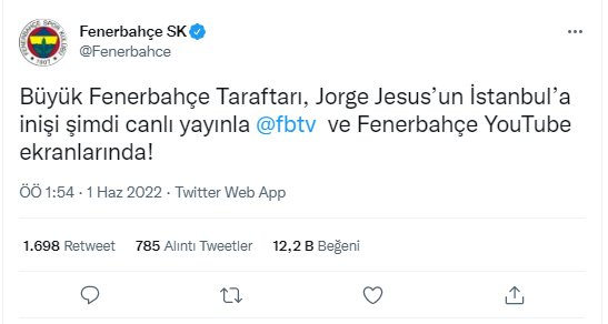 Fenerbahçe Spor Kulübü Jorge Jesus'un İstanbul'a inişini şu tweetle duyurdu:
