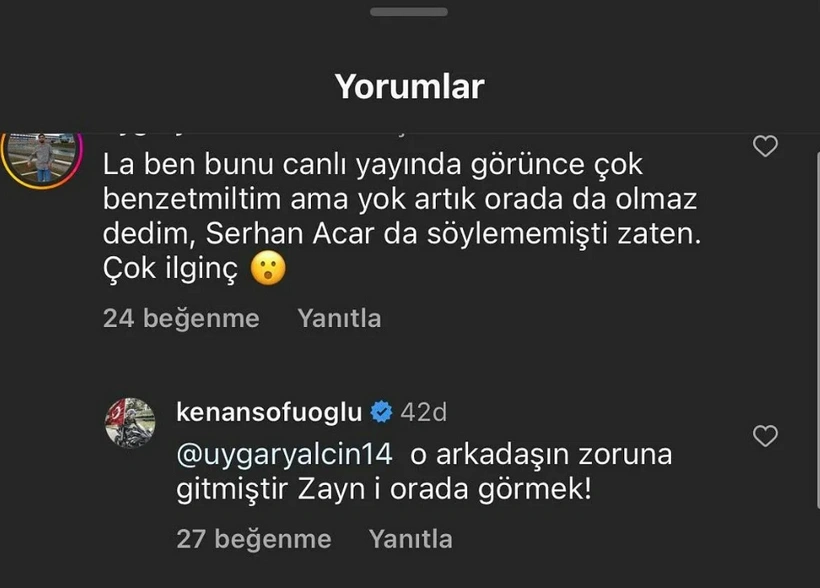 Sofuoğlu daha sonra bir takipçisinin yorumuna da "O arkadaşın zoruna gitmiştir Zayn'ı orada görmek" yanıtını verdi.