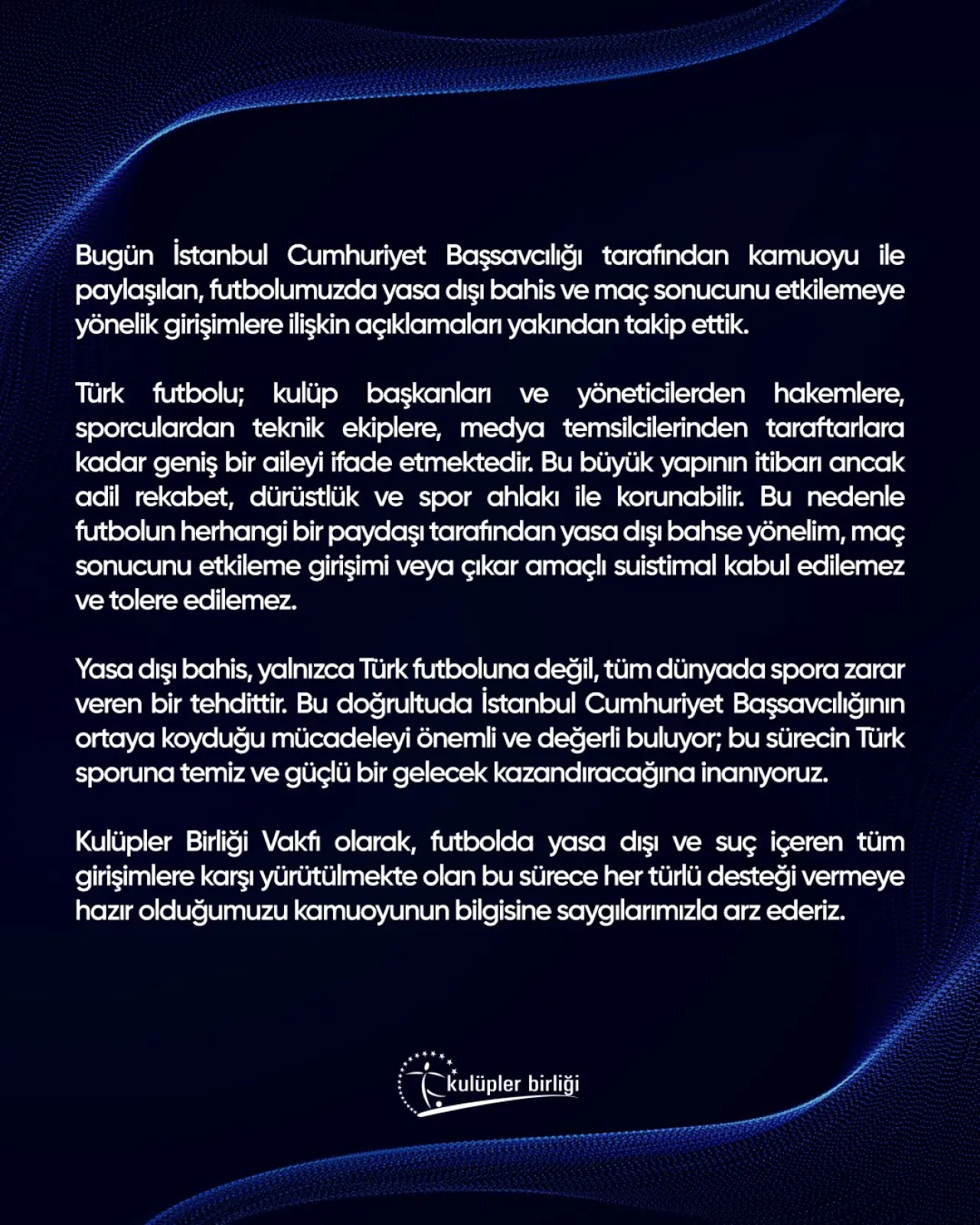 "Yasa dışı bahis, yalnızca Türk futboluna değil, tüm dünyada spora zarar veren bir tehdittir. Bu doğrultuda İstanbul Cumhuriyet Başsavcılığının ortaya koyduğu mücadeleyi önemli ve değerli buluyor; bu sürecin Türk sporuna temiz ve güçlü bir gelecek kazandıracağına inanıyoruz. Kulüpler Birliği Vakfı olarak, futbolda yasa dışı ve suç içeren tüm girişimlere karşı yürütülmekte olan bu sürece her türlü desteği vermeye hazır olduğumuzu kamuoyunun bilgisine saygılarımızla arz ederiz."