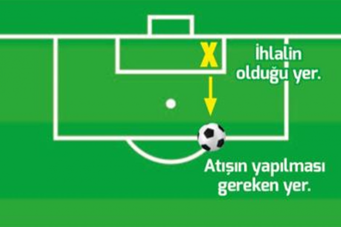 "Hücum eden takım lehine rakip kale alanı içinde verilen endirekt serbest vuruş, kale çizgisine paralel olan kale alanı çizgisi üzerindeki ihlalin yapıldığı yere en yakın noktadan yapılır"