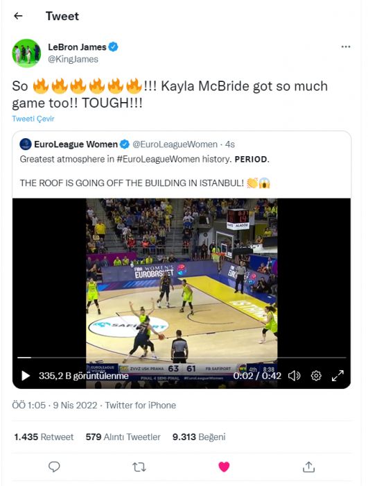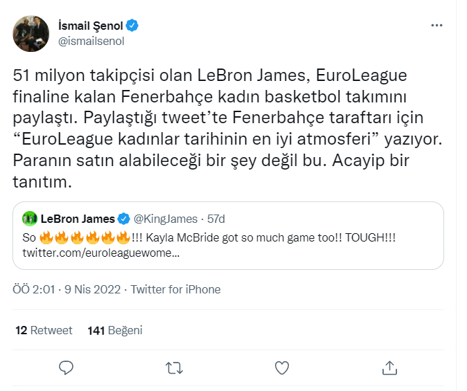 "51 milyon takipçisi olan LeBron James, EuroLeague finaline kalan Fenerbahçe kadın basketbol takımını paylaştı. Paylaştığı tweet’te Fenerbahçe taraftarı için “EuroLeague kadınlar tarihinin en iyi atmosferi” yazıyor. Paranın satın alabileceği bir şey değil bu. Acayip bir tanıtım."