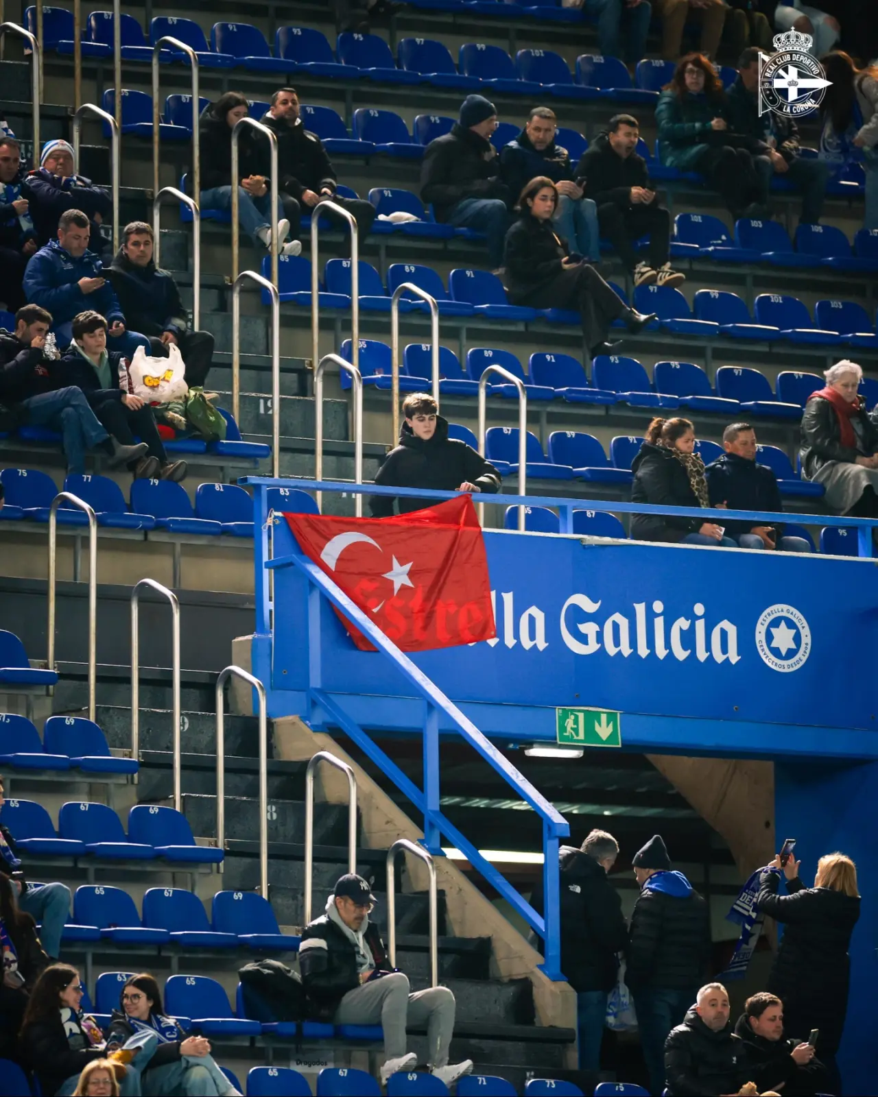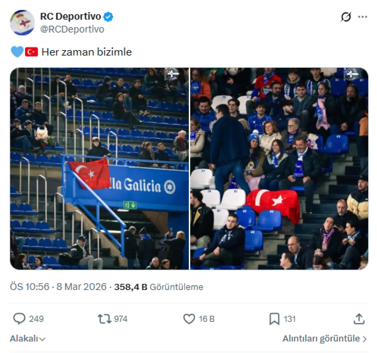 İspanya futbolunun unutulmaz ekiplerinden Deportivo La Coruña, 8 Mart 2026 akşamı resmi sosyal medya hesabından oldukça dikkat çeken bir paylaşıma imza attı. Riazor Stadyumu'nda maçı takip eden taraftarların tribün demirlerine astığı ve ellerinde dalgalandırdığı Türk bayraklarının yer aldığı görseller, "Her zaman bizimle" notu, mavi kalp ve Türk bayrağı emojileriyle paylaşıldı. Kısa sürede yüz binlerce görüntülenmeye ulaşan ve yoğun etkileşim alan bu ileti, Türk futbolseverler tarafından büyük bir beğeniyle karşılandı.