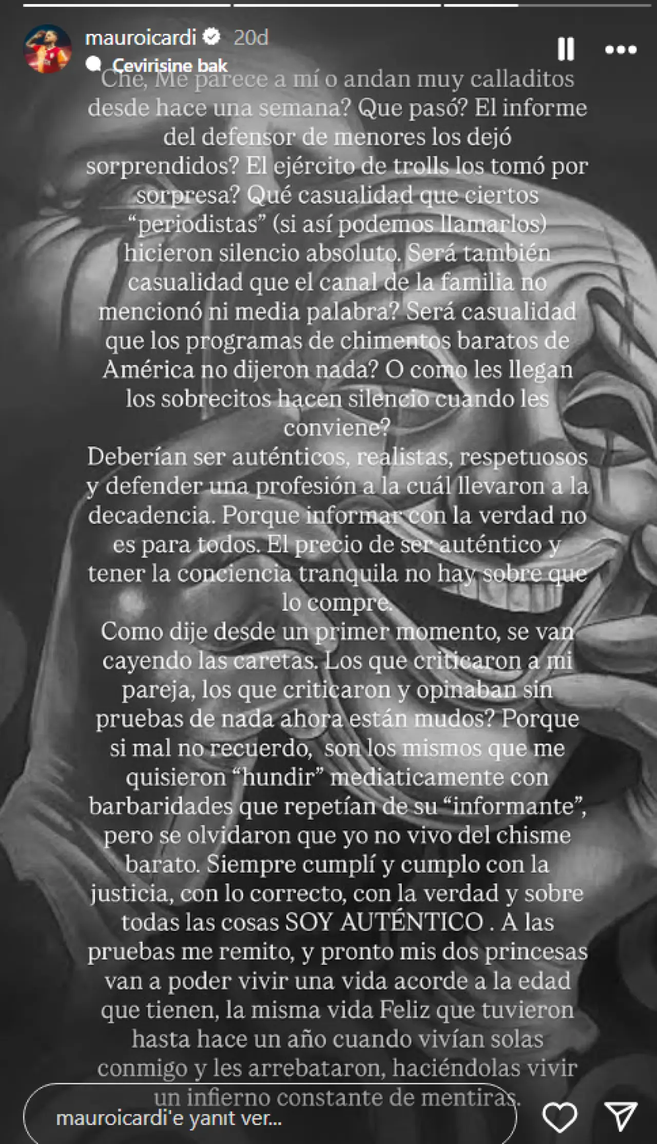 Çocuk hakları savunucusunun raporunun ardından kendisine ve ailesine yönelik eleştirilerin sustuğunu belirten Icardi, “Ne tesadüf ki bazı gazeteciler tamamen sessizliğe büründü. Doğruyu söylemenin bedeli vicdan rahatlığıdır, bunu satın alacak bir zarf yok” ifadelerini kullandı.