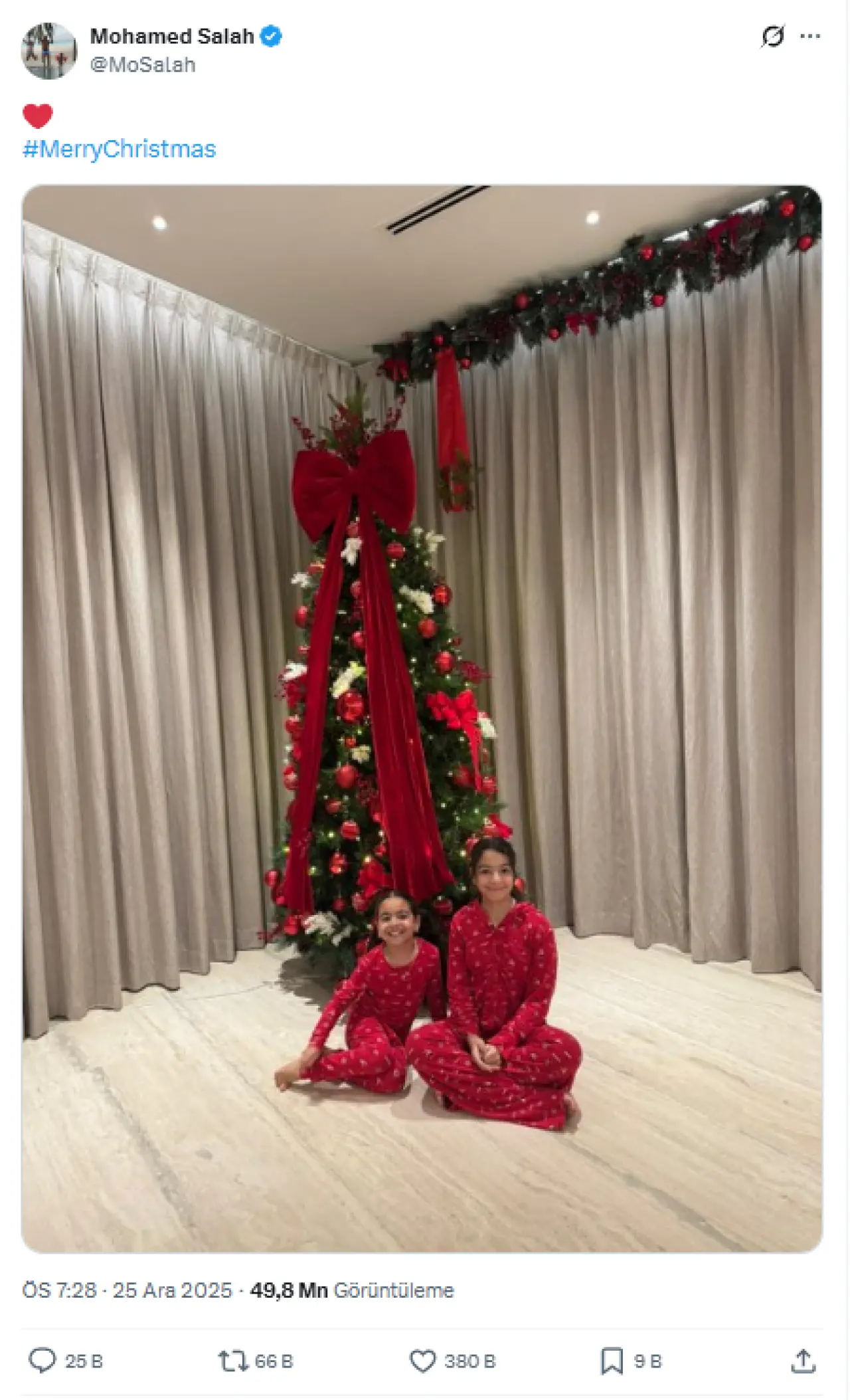 Salah, kızları Makka ve Kayan’ın süslenmiş bir Noel ağacının yanında oturduğu bir fotoğrafı sosyal medya hesabından yayımladı. Fotoğrafa eşlik eden mesaj ise yalnızca “#MerryChristmas” oldu.
