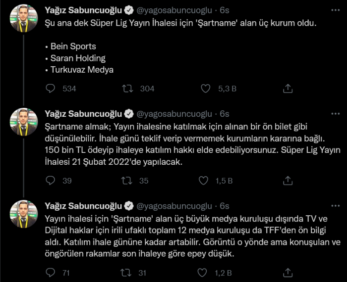 Yayın ihalesi için üç büyük medya kuruluşu "Şartname" aldı. Gazeteci Yağız Sabuncuoğlu’nun Twitter hesabından paylaştığı detaylarda TV ve Dijital haklar için irili ufaklı toplam 12 medya kuruluşu da TFF’den ön bilgi aldı.