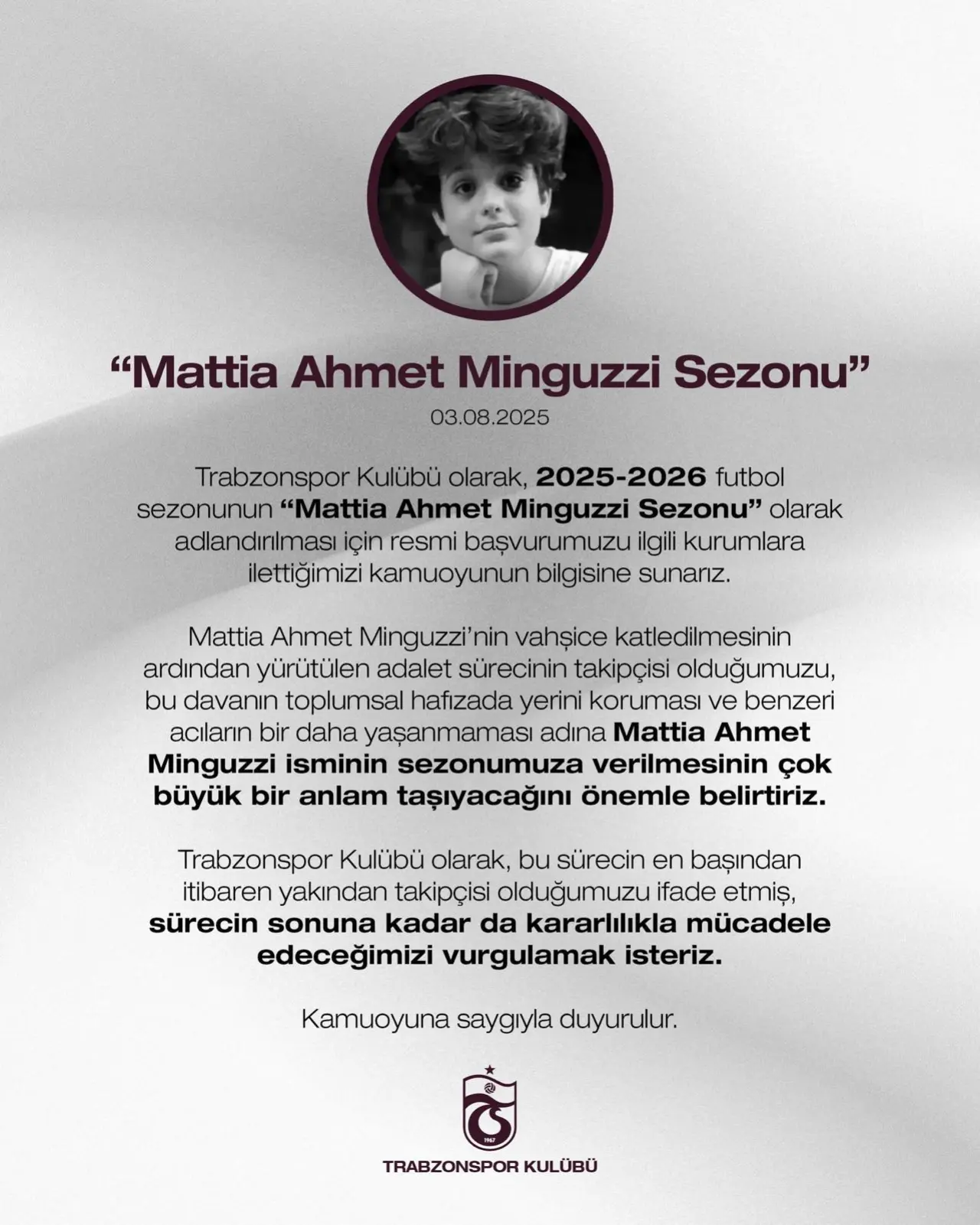 “Trabzonspor Kulübü olarak, 2025-2026 futbol sezonunun ‘Mattia Ahmet Minguzzi Sezonu’ olarak adlandırılması için resmi başvurumuzu ilgili kurumlara ilettiğimizi kamuoyunun bilgisine sunarız. Mattia Ahmet Minguzzi’nin vahşice katledilmesinin ardından yürütülen adalet sürecinin takipçisi olduğumuzu, bu davanın toplumsal hafızada yerini koruması ve benzeri acıların bir daha yaşanmaması adına bu ismin sezonumuza verilmesinin çok büyük bir anlam taşıyacağını önemle belirtiriz.”