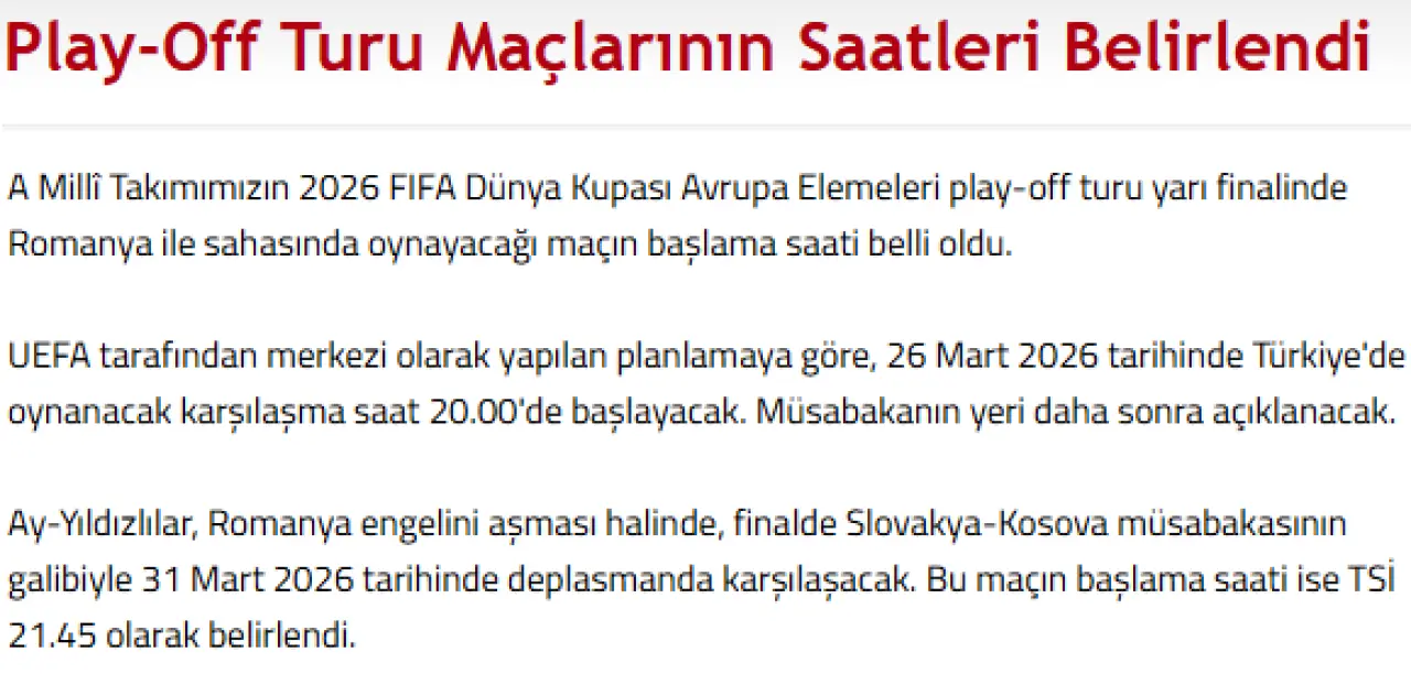 Ay-yıldızlılar, Romanya'yı elemesi halinde finalde Slovakya-Kosova müsabakasının galibiyle 31 Mart 2026'da deplasmanda karşılaşacak. Müsabaka, TSİ 21.45'te başlayacak.