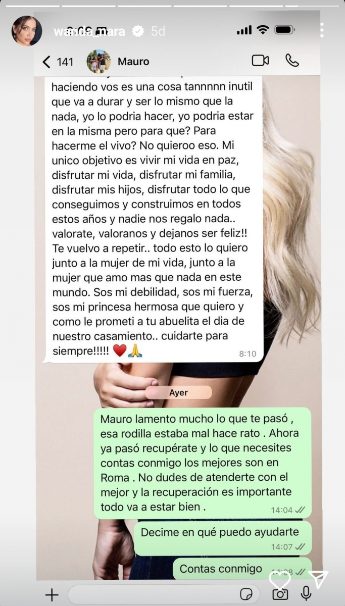 Bu kez Wanda Nara, Tottenham maçında çapraz bağları kopan Galatasaray'ın Arjantinli yıldızı Mauro Icardi'ye attığı mesajı sosyal medya hesabından yayınladı.