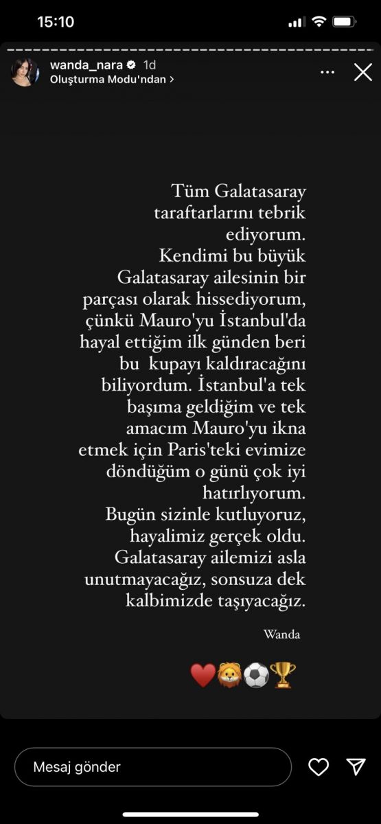 ”Tüm Galatasaray taraftarlarını tebrik ediyorum. Kendimi bu büyük Galatasaray ailesinin bir parçası olarak hissediyorum, çünkü Mauro’yu İstanbul’da hayal ettiğim ilk günden beri bu kupayı kaldıracağını biliyordum. İstanbul’a tek başıma geldiğim ve tek amacım Mauro’yu ikna etmek için Paris’teki evimize döndüğüm o günü çok iyi hatırlıyorum. Bugün sizinle kutluyoruz, hayalimiz gerçek oldu. Galatasaray ailemizi asla unutmayacağız, sonsuza dek kalbimizde taşıyacağız.”