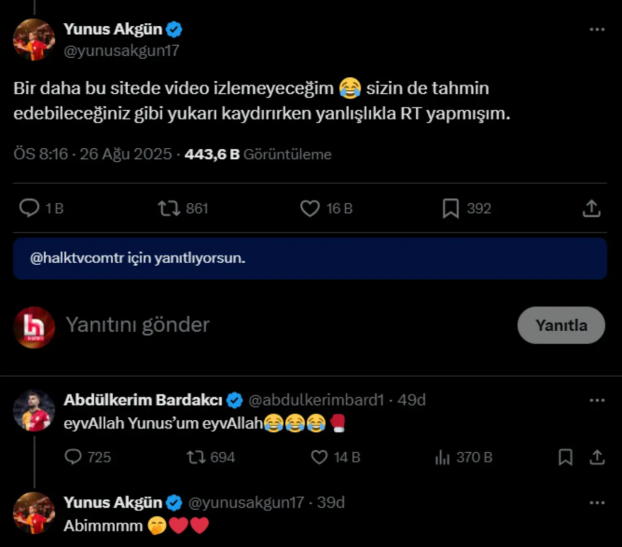 Yunus Akgün, sosyal medya hesabından “Galatasaray'ın Akanji veya Singo'ya ihtiyacı yok. Galatasaray'ın Akanji ve Singo'ya ihtiyacı var” yazısıyla paylaşılan ve Abdülkerim Bardakçı’nın çalım yediği videoyu yanlışlıkla yeniden paylaştı.