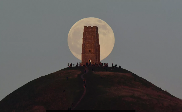 İnsanlar İngiltere'de Glastonbury Tor tepesindeki Aziz Michael kulesinin arkasından ayın doğuşunu izledi